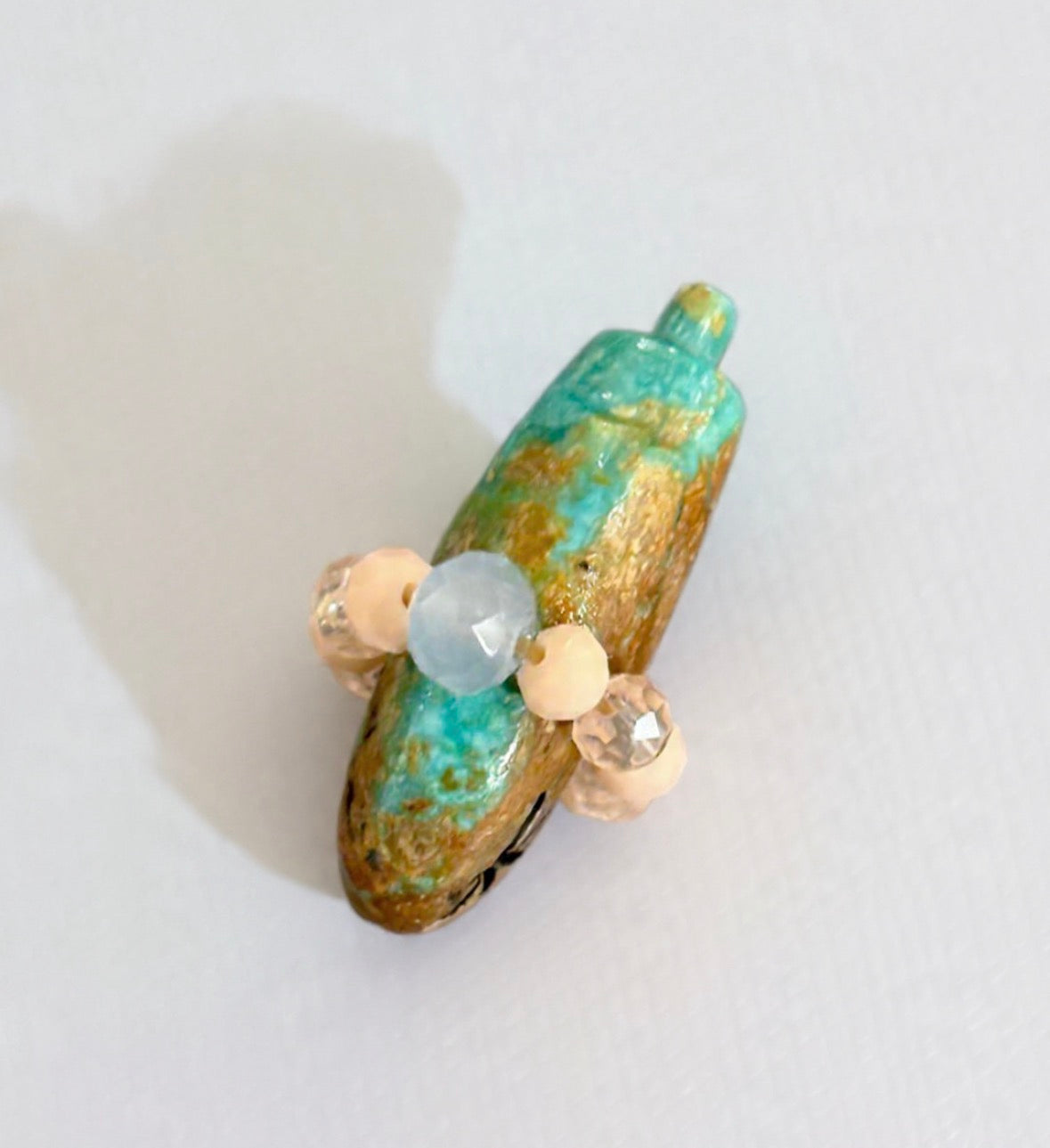 Kingman turquoise bear with jet eyes and offering bundle of crystal glass beads.