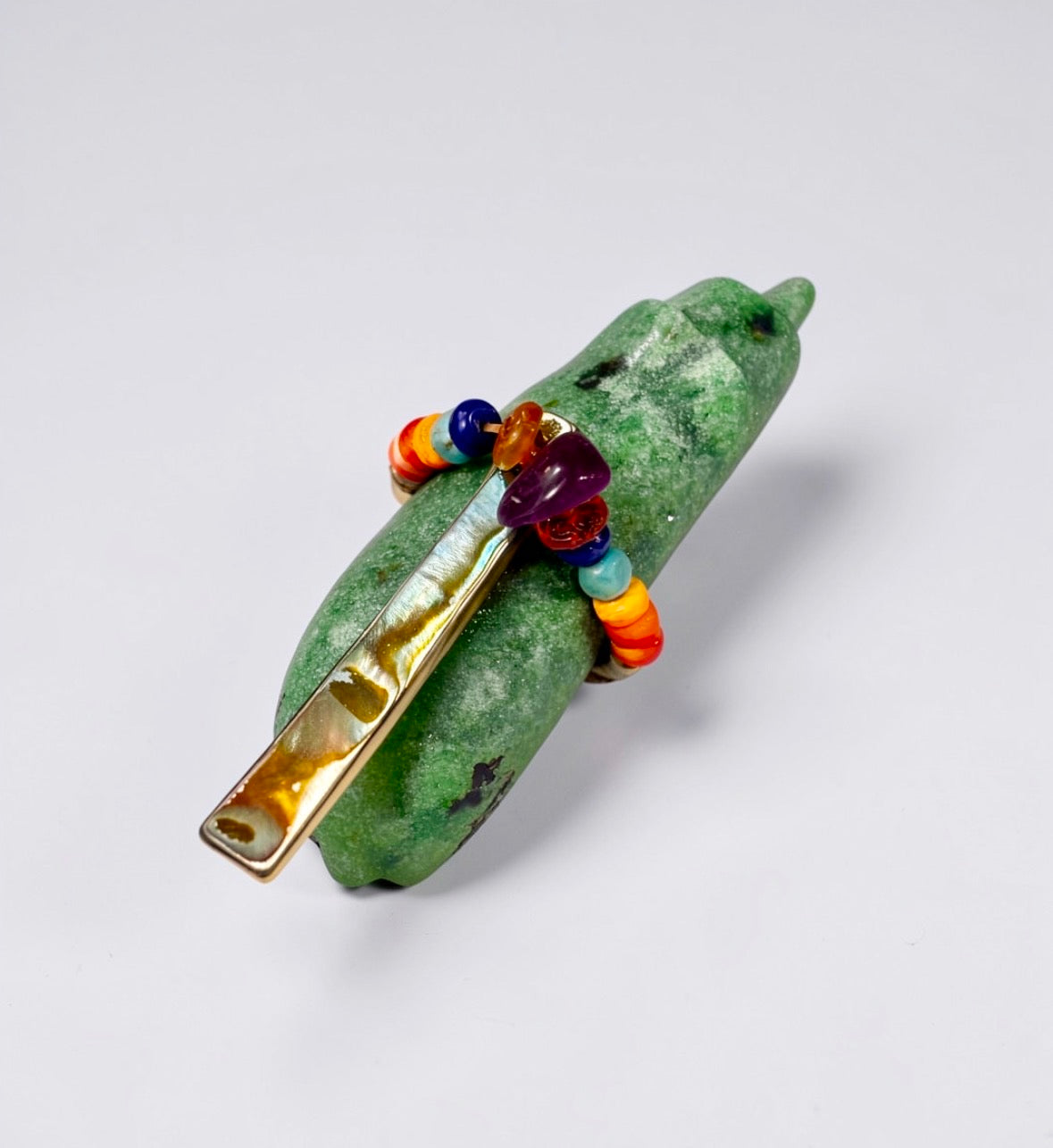 Offering bundle consists of abalone, orange spiny oyster, turquoise, lapis, fossilized amber, and purple fluorite.