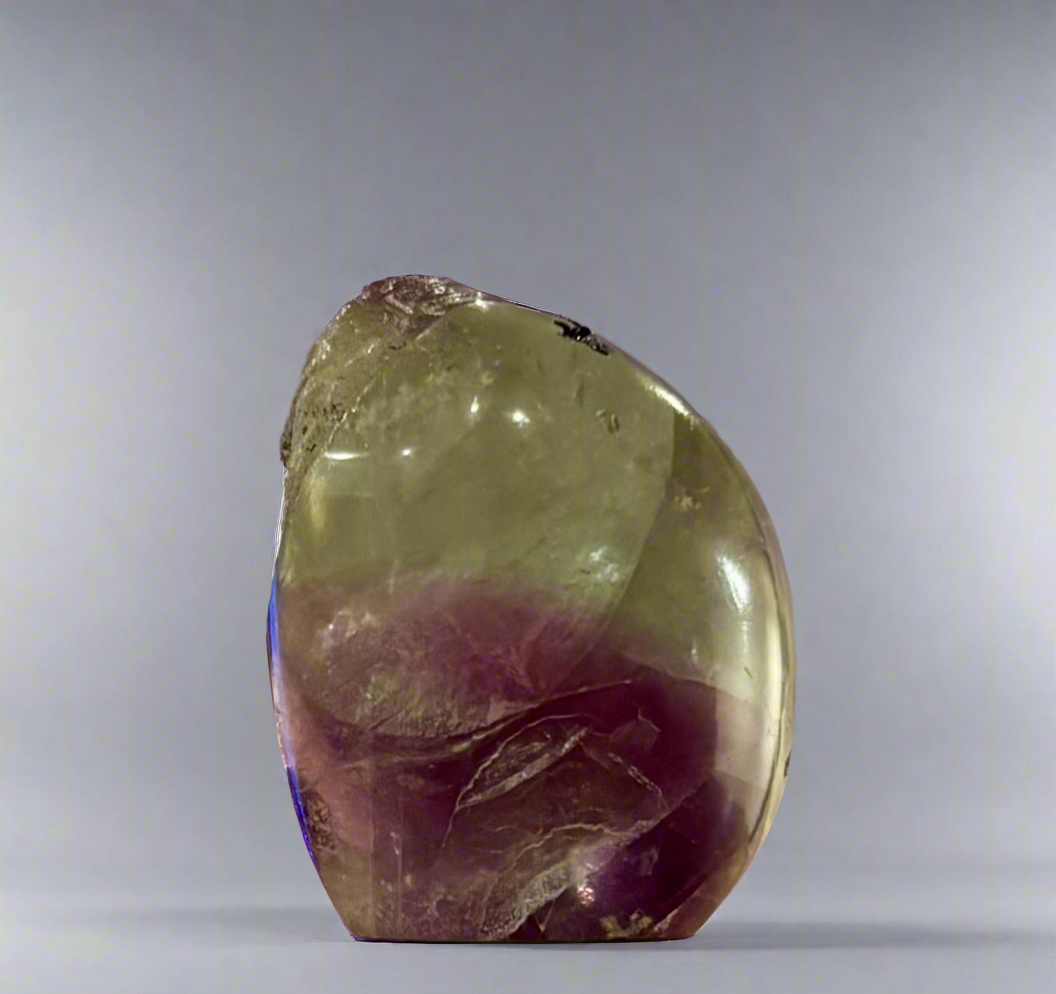 Hand carved green and purple fluorite corn maiden with overlaid gold lip mother of pearl face and incised dragonfly and stars.